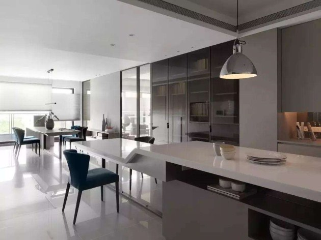3、半開(kāi)放式廚房在隔斷設(shè)計(jì)上,通常會(huì)采用玻璃材質(zhì),由于質(zhì)輕、透明光滑,讓空間光線更加明亮,還有擴(kuò)展空間的視覺(jué)效果。