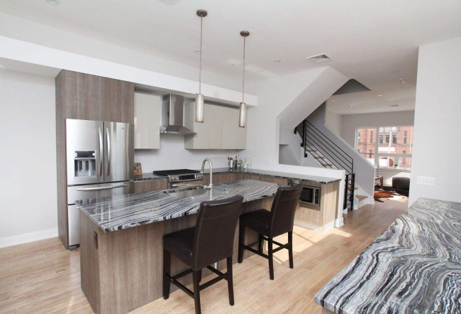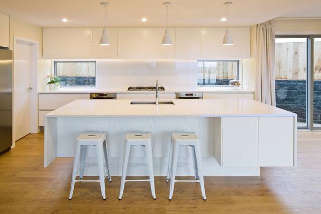 2、半開(kāi)放式廚房在裝修的時(shí)候可以選擇白色的板材與灰色條紋的墻壁結(jié)合,讓空間很具和諧的視覺(jué)美感。