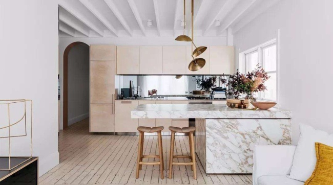 4、廚房運(yùn)用天然的木材和白色調(diào)來(lái)進(jìn)行打造,使空間盡顯明亮和光潔,而且簡(jiǎn)易的木質(zhì)吧臺(tái)餐桌椅,又讓人感到格外的溫馨。