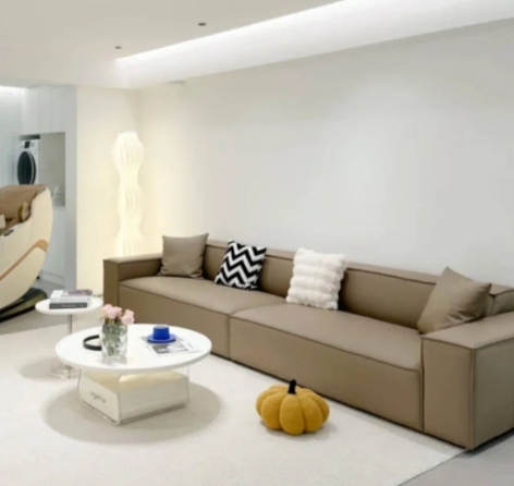 1、大白墻+淺灰柔光磚+卡其灰豆腐塊沙發(fā):簡潔大方的現(xiàn)代簡約風格,沙發(fā)線條利落耐看,深色容易打理,適合有小孩的家庭,落地款無衛(wèi)生死角
