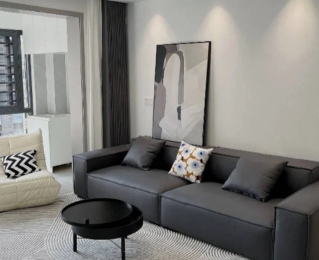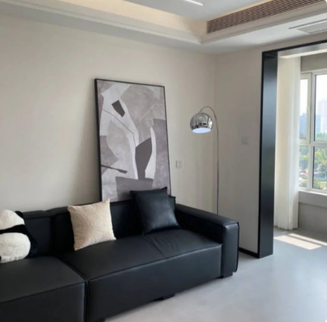 5、大白墻+米灰色柔光磚+黑色豆腐塊沙發(fā):極簡高級風,黑白灰基礎搭配百搭不易過時,采光佳更容易凸顯高級質(zhì)感,掛畫裝飾減輕沙發(fā)的沉悶感