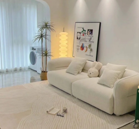 3、大白墻+暖灰色亮面磚+米白色羊羔絨沙發(fā):溫馨奶油風,空間更溫暖舒適,但淺色沙發(fā)確實不好打理,有小孩寵物的家庭慎選