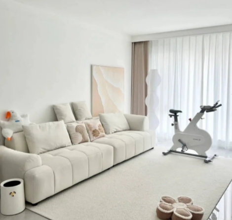 4、大白墻+淺灰亮面磚+奶白色棉花沙發(fā):精致輕奶油風,整體淺色搭配顯空間更通透明亮,適合采光一般的樓層,擔心太寡淡可添加亮色抱枕點綴