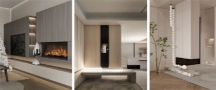 壁爐在當下的設計中也非常常見,壁爐在定制過程中由于本身的功能使用需求,上方柜體都要做成懸浮式,不管是一面靠墻還是全部懸空,效果都非常美觀。