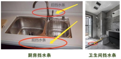 條形裝置的高度和地面以及臺面形成一定高度,以防止廚房臺面的積水漫流到地面,衛(wèi)生間淋浴區(qū)的積水漫出到干區(qū),達到干濕分離的目的。