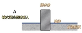 鋪水泥沙漿時留一條槽,嵌入擋水條,之后對地面進行整體的地磚的鋪貼,這種方式擋水的效果是最佳的,也不太容易產生滲水的問題。這種方式對擋水條的硬度要求比較高,需要兩頭的密閉性好。擋水條預埋嵌入到地面瓷磚以下的深度一般在15-20MM左右。