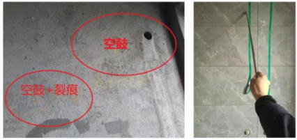 有的還可以直接通過肉眼來觀察,如果空鼓了,這個(gè)部位要比其他的稍微高一些,同時(shí)表面可能還會有裂縫。但是,如果用手按下去,發(fā)現(xiàn)里面其是空的。
