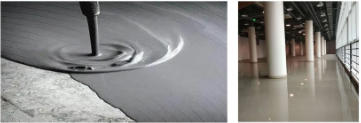 調(diào)配好的呈流體狀,具備良好的流動(dòng)性,不需要像水泥砂漿找平多重振搗抹壓,倒在需要找平的地面上通過自流平耙子輔助加快材料自然流平。